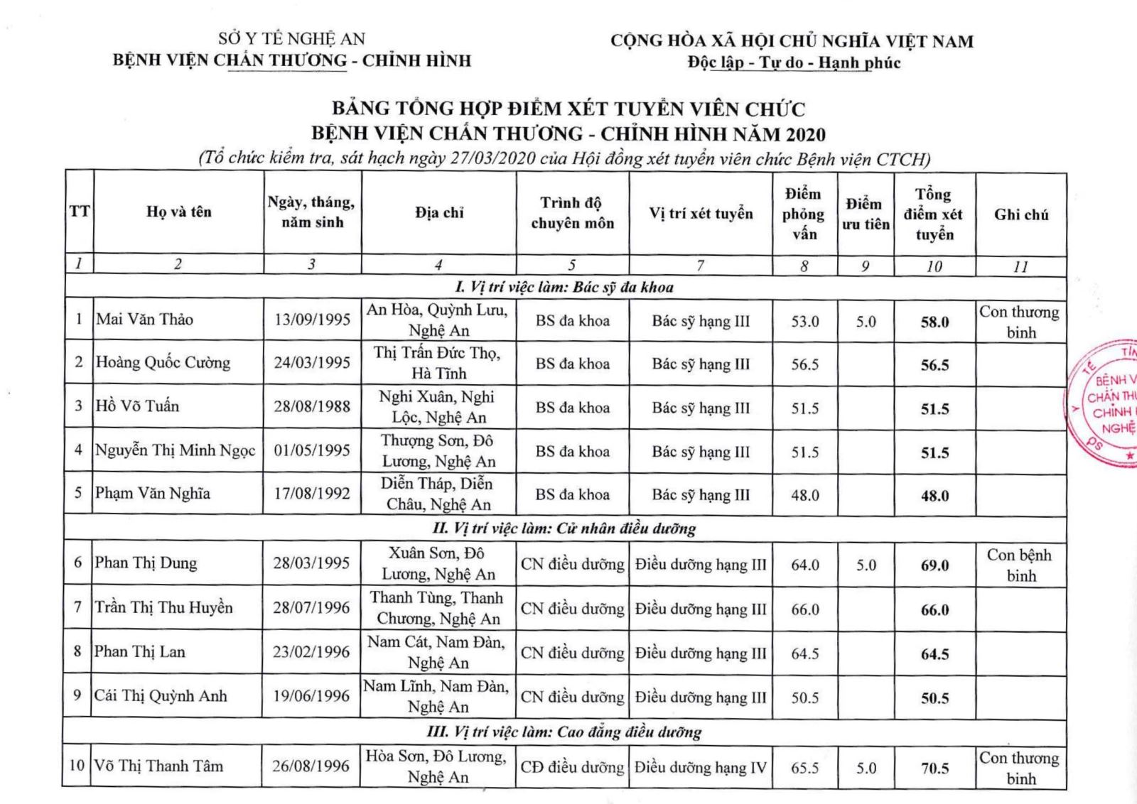 Bệnh viện Chấn thương Chỉnh hình Nghệ An thông báo bảng tổng hợp điểm xét tuyển viên chức năm 2020 như sau:
