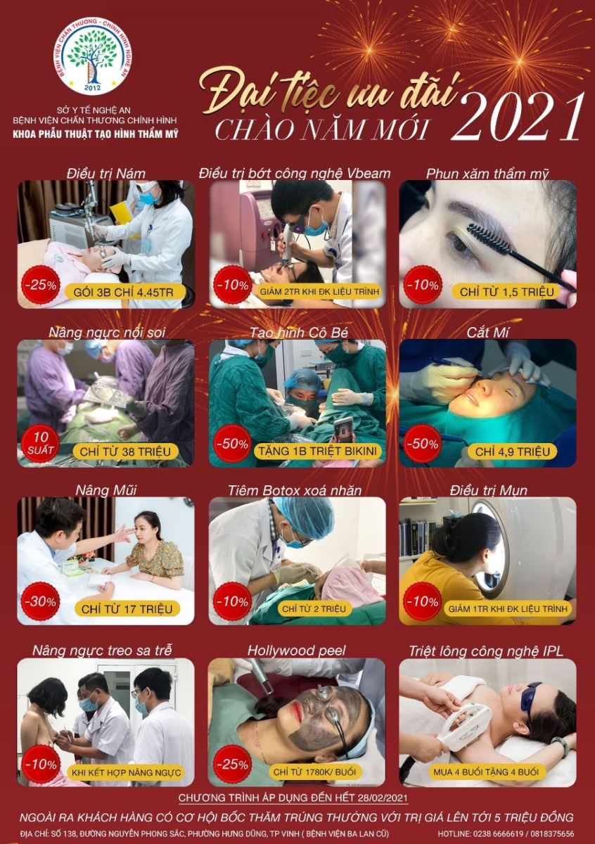 Là một đơn vị dẫn đầu trong việc phẫu thuật tạo hình thẩm mỹ, khoa Phẫu thuật tạo hình thẩm mỹ Bệnh viện Chấn thương Chỉnh hình Nghệ An ngày càng chứng minh được vị thế, ủy tín, đẳng cấp của mình trong “sứ mệnh làm đẹp”. Để chào đón năm mới 2021, Khoa hân hạnh gửi tới quý khách hàng với “đại tiệc ưu đãi” lớn nhất trong năm.