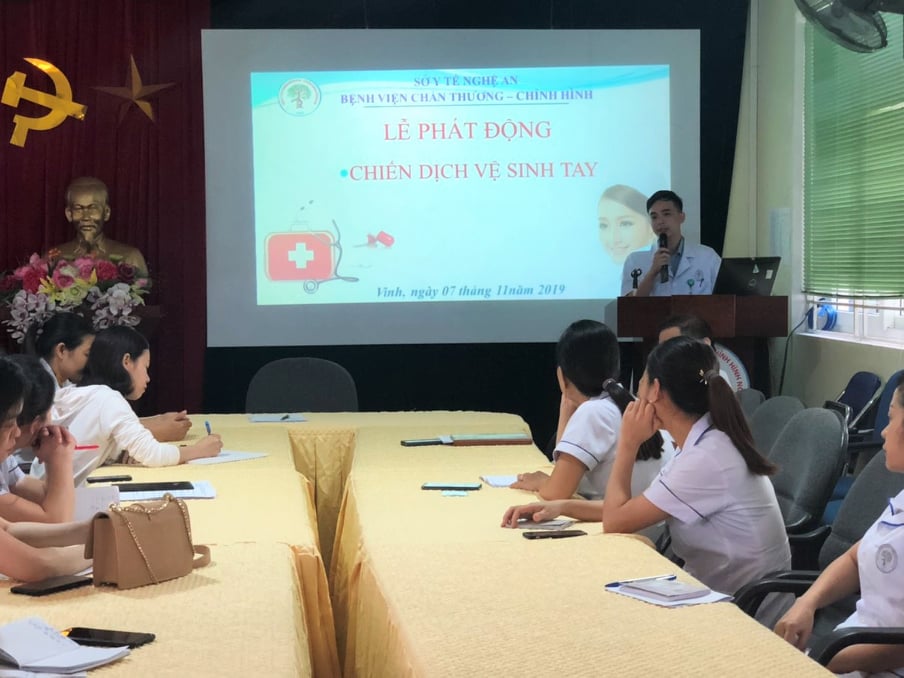 Hưởng ứng chiến dịch “Phòng ngừa nhiễm khuẩn do chăm sóc y tế - chính từ nơi bàn tay bạn” do Tổ chức Y tế Thế giới (WHO) phát động, ngày hôm qua, 7/11/2019, Khoa kiểm soát nhiễm khuẩn - Bệnh viện Chấn thương chỉnh hình Nghệ An đã tổ chức lễ phát động chiến dịch vệ sinh tay tới toàn thể nhân viên y tế. Toàn thể cán bộ công nhân viên Bệnh viện đã cam kết cùng nhau tuân thủ và thực hiện theo “5 thời điểm cần rửa tay đối với nhân viên y tế“ và “quy trình rửa tay 6 bước của Bộ y tế” để cùng chung tay chống lại nguy cơ nhiễm khuẩn.