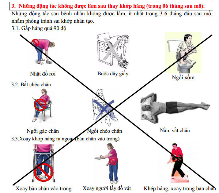 • Cần tránh: ngồi xổm, ngồi xếp bằng, bắt chéo chân, cúi nhặt đồ rơi. Không để bàn chân xoay trong khi đứng, không ngồi hoặc nằm võng, quỳ gối.