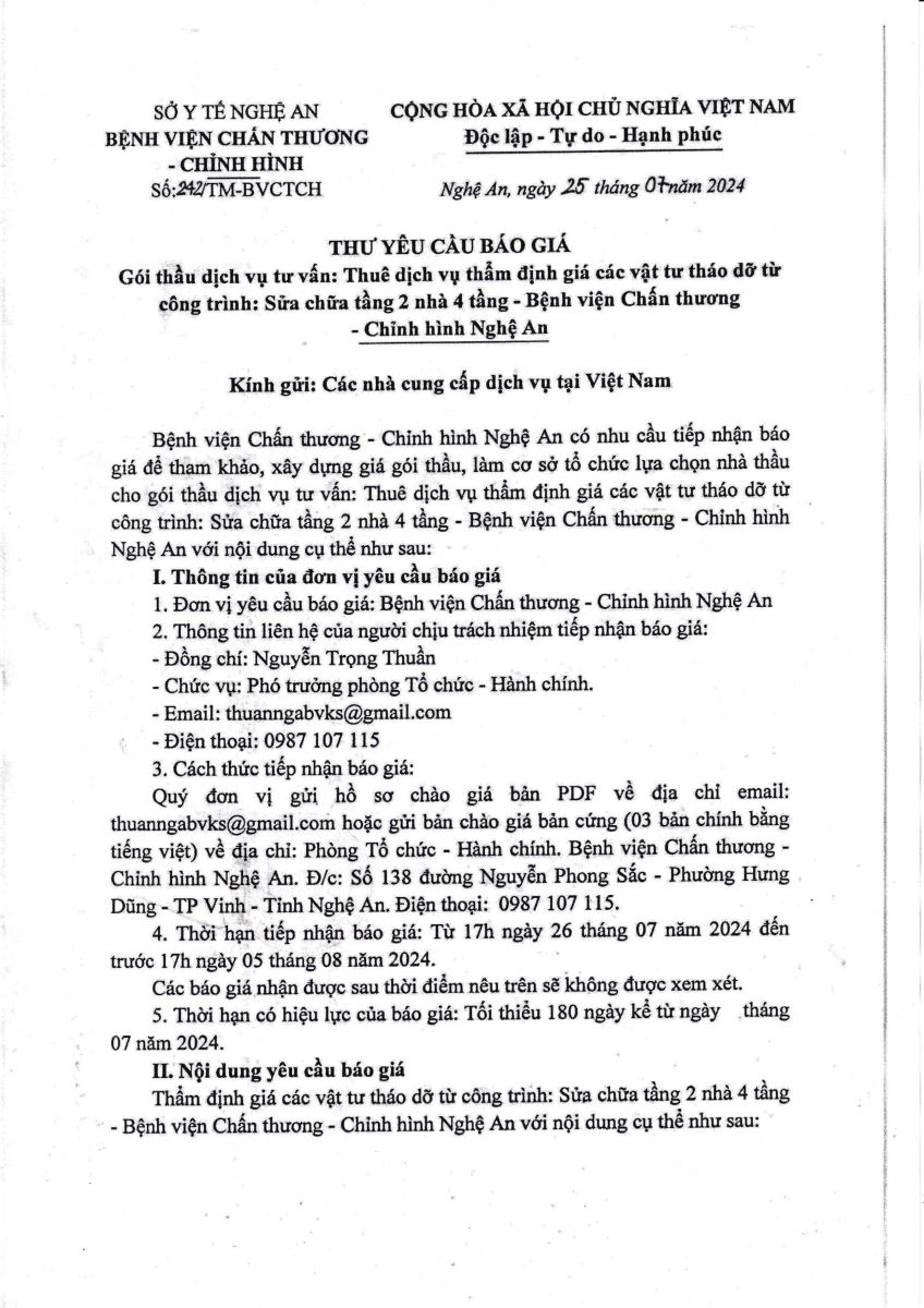 Thư yêu cầu báo giá: Gói thầu dịch vụ tư vấn: Thuê dịch vụ thẩm định giá các vật tư tháo dỡ từ công trình: Sửa chữa tầng 2 nhà 4 tầng - Bệnh viện Chấn thương Chỉnh hình Nghệ An